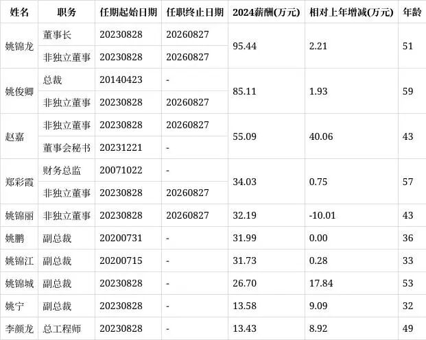 董事长姚锦龙薪酬最高,为95.44万元;总裁姚俊卿以85.11万元紧随其后;董事会秘书赵嘉薪酬55.09万元,排在第三位。